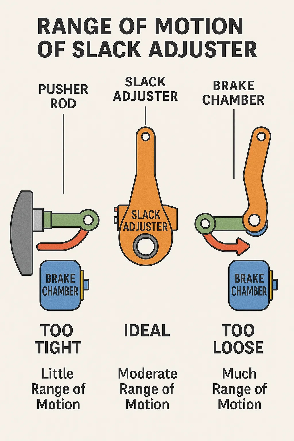 Het 'bewegingsbereik', of professioneler gezegd, de remslag, verwijst naar de afstand die de remsteller beweegt wanneer hij aan de duwstang trekt tijdens de activering van het luchtremsysteem.